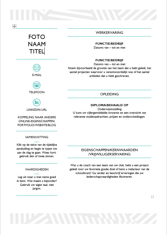 Recruiters, uitzendbureaus en bedrijven krijgen dagelijks stapels CV’s binnen. Zorg er daarom voor dat jouw CV opvalt en dat het niet te lang is. Je hoeft geen grafisch vormgever te zijn om je CV visueel aantrekkelijk te maken. Dit kan tegenwoordig al met Word, waar je op het startscherm keuze hebt uit een aantal CV templates, die je enkel hoeft in te vullen met jouw gegevens en een foto.